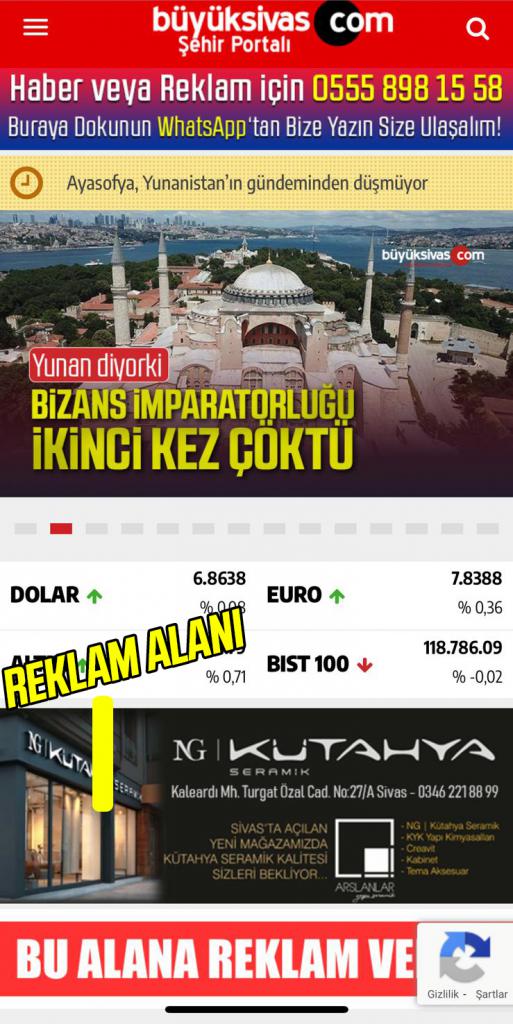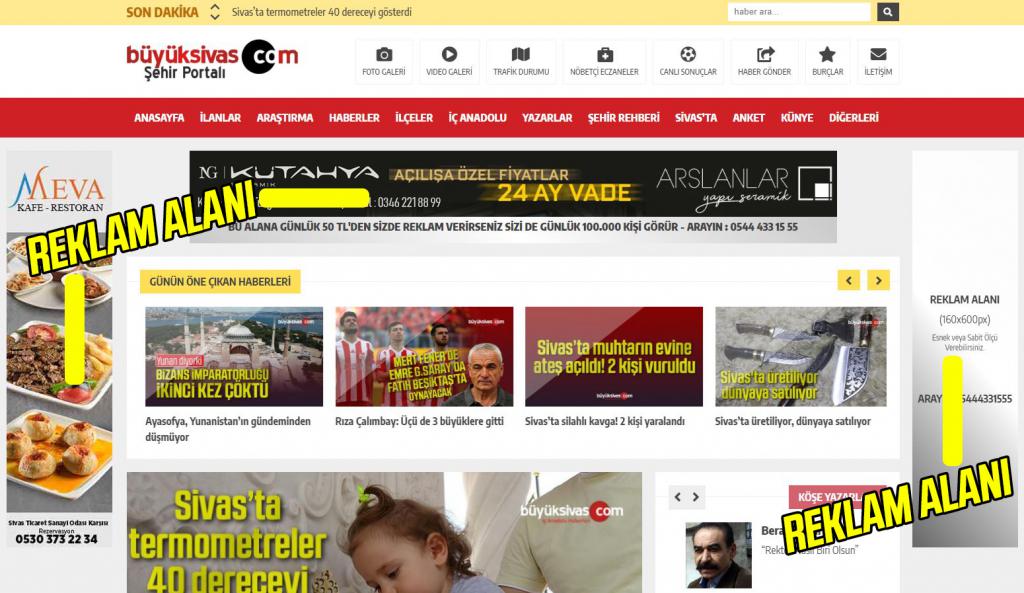 buyuksivas.com Web Portal ve Mobil Portal başta olmak üzere, sosyal medya mecralarının kapaklarına da reklam verebilirsiniz. Portalımızda Kule, Portal Üst, Haber Üst, Haber İçi ve Haber Alt alanları olmak üzere farklı ölçülerde bir çok reklam alanı bulunmakta.