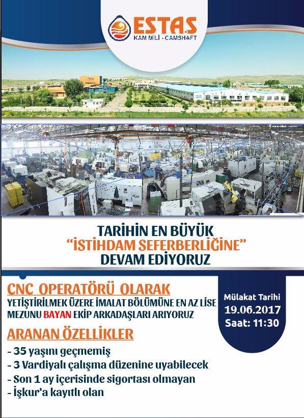 CNC Operatörü olarak yetiştirilmek üzere İmalat bölümünde görevlendirilecek bayan ekip arkadaşları arayan ESTAŞ’ın personel ilanı şu şekilde: