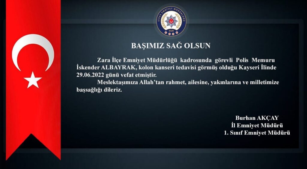 Sivas Emniyet Müdürlüğü Twitter hesabından yapılan açıklamada, "Zara İlçe Emniyet Müdürlüğü kadrosunda görevli Polis Memuru İskender Albayrak, kolon kanseri görmüş olduğu Kayseri ilinde 29.06.2022 günü vefat etniştir.