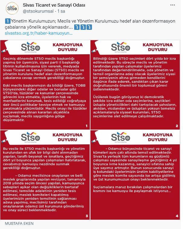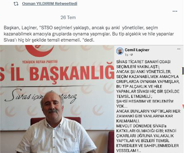 Yeniden Refah Partisi Sivas İl Başkanı Cemil Laçiner'in mevcut STSO Başkanı Mustafa Eken ve yönetim kurulunu eleştirdiği paylaşımın yer aldığı haberi STSO önceki dönem Başkanı İş Adamı Osman Yıldırım sosyal medya hesabından retweet ederek destek çıktı.