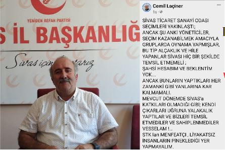 Geçtiğimiz günlerde Yeniden Refah Partisi Sivas İl Başkanı Cemil Laçiner, “STSO seçimleri yaklaştı, ancak şu anki yöneticiler, seçim kazanabilmek amacıyla gruplarda oynama yapmışlar. Bu tip alçaklık ve hile yapanlar Sivas’ı hiç bir şekilde temsil etmemeli. “dedi.