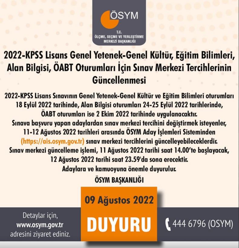 Sınava başvuru yapan adaylardan sınav merkezi tercihini değiştirmek isteyenler, 11-12 Ağustos 2022 tarihleri arasında ÖSYM Aday İşlemleri Sisteminden (https://ais.osym.gov.tr) sınav merkezi tercihlerini güncelleyebileceklerdir. Sınav merkezi güncelleme işlemi, 11 Ağustos 2022 tarihi saat 14.00’te başlayacak, 12 Ağustos 2022 tarihi saat 23.59'da sona erecektir." ifadeleri kullanıldı.-ensonhaber