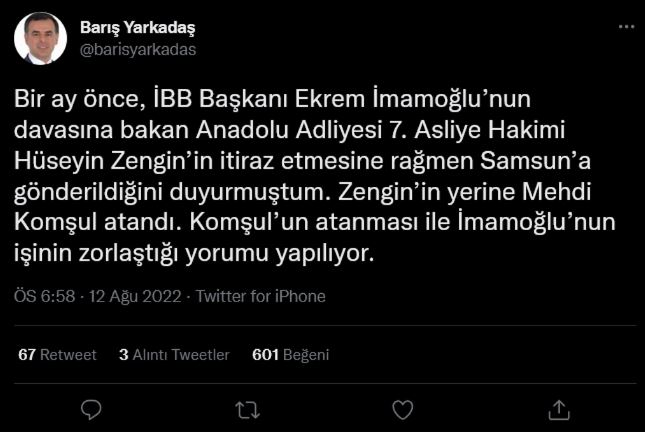 “Bir ay önce, İBB Başkanı Ekrem İmamoğlu’nun davasına bakan Anadolu Adliyesi 7. Asliye Hakimi Hüseyin Zengin’in itiraz etmesine rağmen Samsun’a gönderildiğini duyurmuştum. Zengin’in yerine Mehdi Komşul atandı. Komşul’un atanması ile İmamoğlu’nun işinin zorlaştığı yorumu yapılıyor.