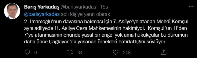Yarkadaş, dün Twitter hesabından konuyla ilgili bir paylaşım yaptı. Zengin’in yerine 11. Asliye Ceza’dan Mehdi Komşul’un atandığını belirterek, “İmamoğlu’nun işinin zorlaştığı yorumu yapılıyor” ifadelerini kullandı. Yarkadaş’ın paylaşımı şöyle:
