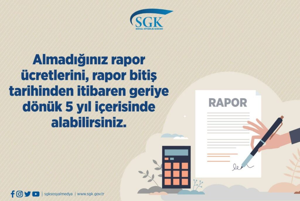 SGK sosyal medyadan yapılan açıklamada; "Almadığınız rapor ücretlerini, rapor bitiş tarihinden itibaren geriye dönük 5 yıl içerisinde alabilirsiniz." ifadelerine yer verildi.
