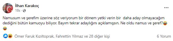 Karakoç paylaşımında "Namusum ve şerefim üzerine söz veriyorum bir dönem yetki verin bir daha aday olmayacağım dediğini bütün kamuoyu biliyor. Bayım tekrar adaylığını açıklamışsın. Ne oldu namus ve şeref?" ifadelerine yer verirken yapılan bu paylaşıma Başkan Halil İbrahim Temiz'in nasıl bir tepki vereceği ise merak konusu...