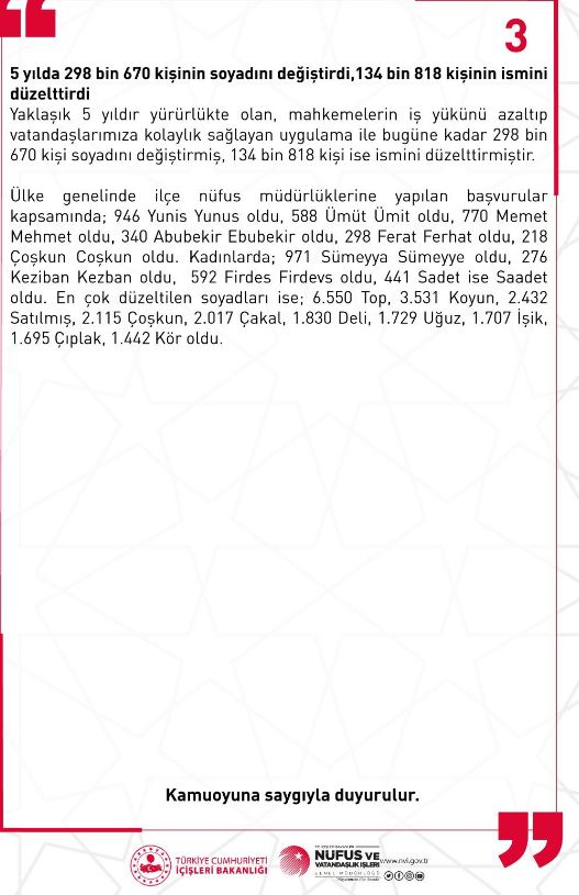 Yapılan açıklamaya göre 5 yılda 298 bin 670 kişinin soyadı değiştirirken, 134 bin 818 kişi ise ismini düzelttirdi.