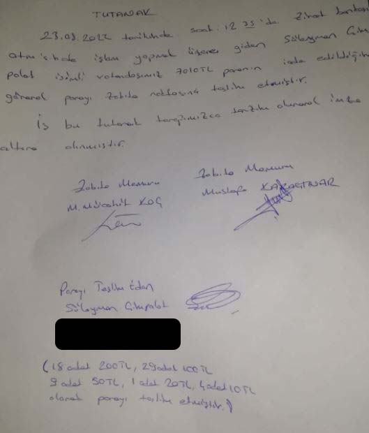 Teslim edilen para tutanak altına alınırken Çinpolat bu hareketiyle insanlık ölmemiş dedirtti.