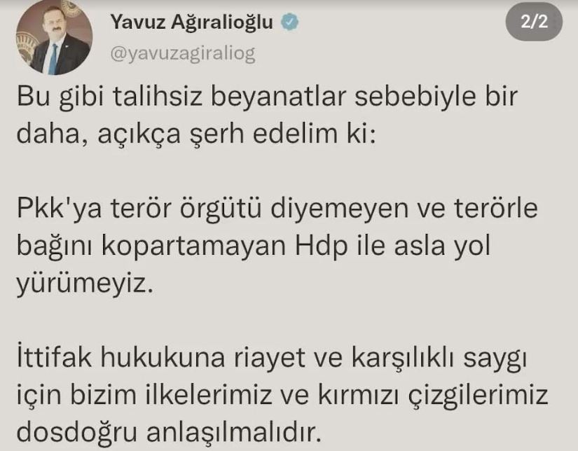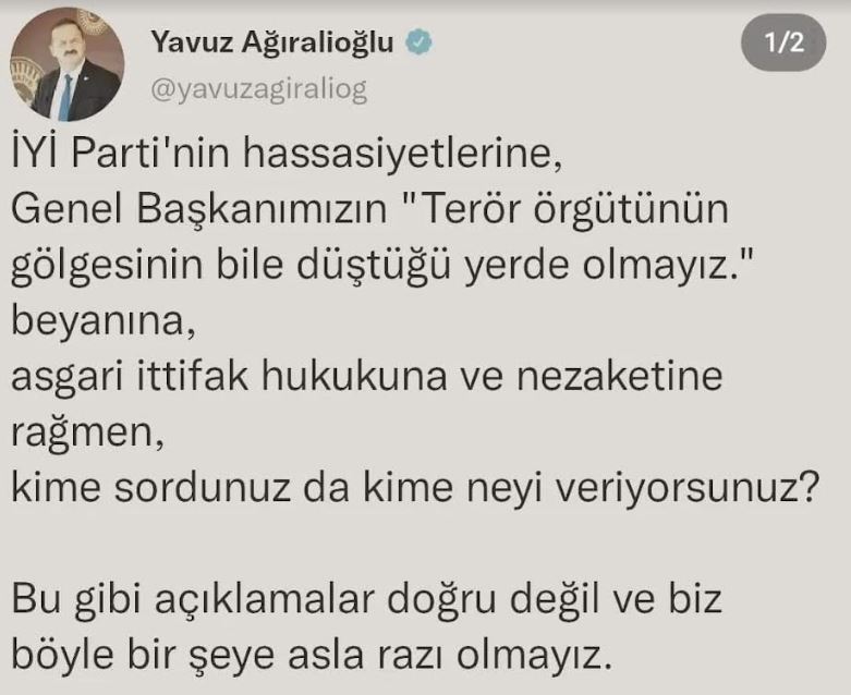 Sosyal medya hesabından paylaşımda bulunan Ağıralioğlu, "İYİ Parti'nin hassasiyetlerine, Genel Başkanımızın "Terör örgütünün gölgesinin bile düştüğü yerde olmayız." beyanına, asgari ittifak hukukuna ve nezaketine rağmen, kime sordunuz da kime neyi veriyorsunuz? Bu gibi açıklamalar doğru değil ve biz böyle bir şeye asla razı olmayız." dedi.