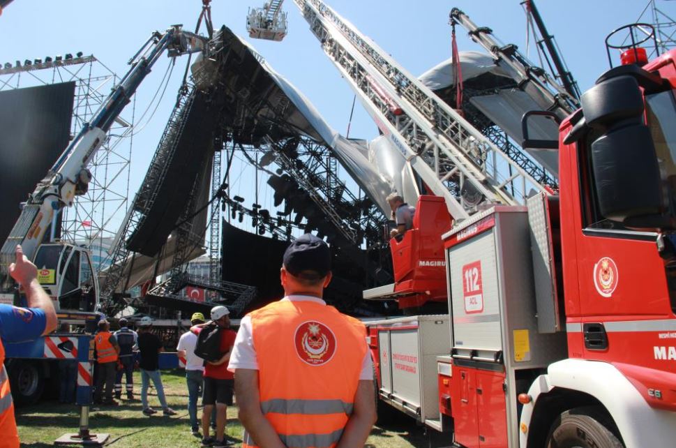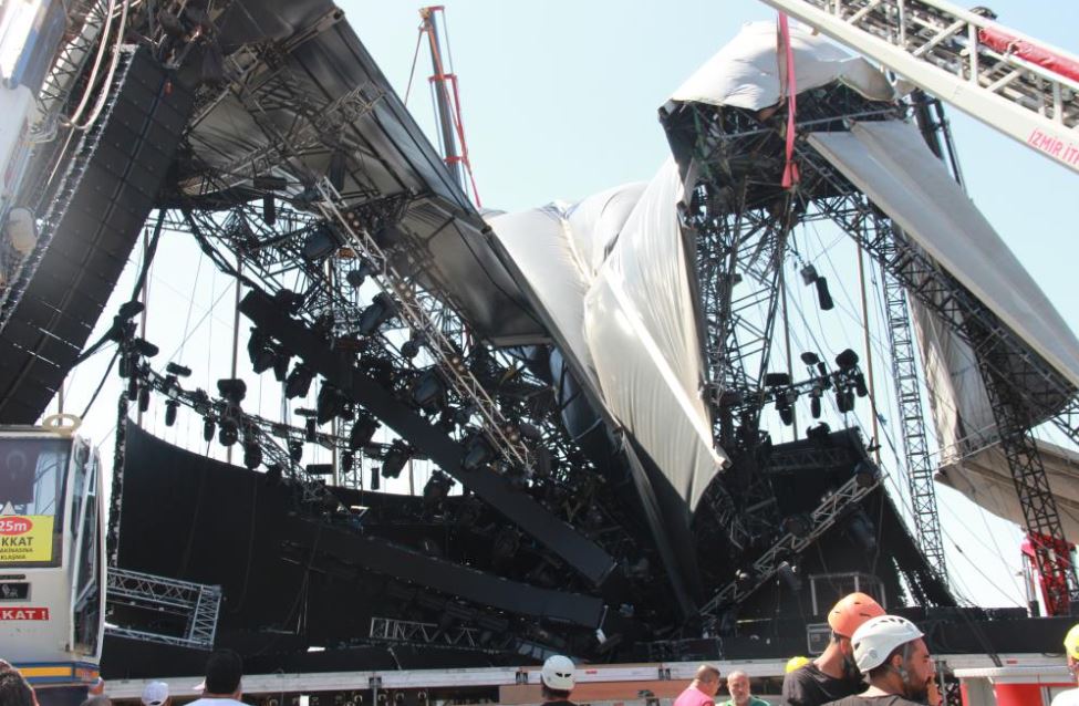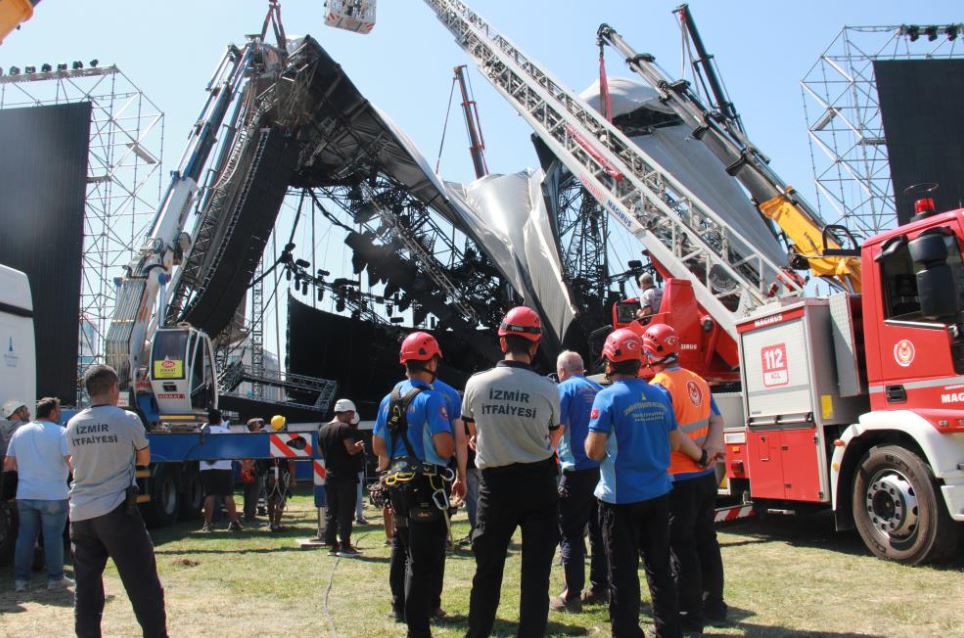 Çarşamba gecesi çöken Kordonboyu'ndaki konser alanında çalışmalar gün boyu devam etti. İzmir Büyükşehir Belediyesi itfaiye araçları ve 6 adet vincin yeni bir kaza riskine karşı sabitlediği platform parça parça kaldırılıyor.