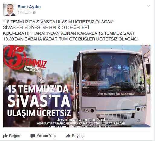 15 Temmuz hain darbe girişiminin yıl dönümü nedeniyle düzenlenecek ülke genelinde toplu taşıma hizmetlerinin ücretsiz olacağı Resmi Gazetede yayınlanmıştı. Ülke genelinde sabah 06.00'dan itibaren ücretsiz sağlanan Otobüsler , Sivas'ta maalesef uygulanmıyordu.