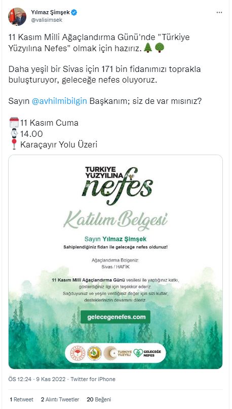Sivas Valisi Yılmaz Şimşek sosyal medya hesabından yaptığı açıklamada: "11 Kasım Milli Ağaçlandırma Günü'nde "Türkiye Yüzyılına Nefes" olmak için hazırız.