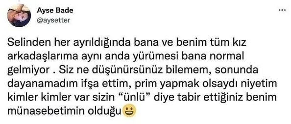 Ayşe Bade, konu hakkında "Selinden her ayrıldığında bana ve benim tüm kız arkadaşlarıma aynı anda yürümesi bana normal gelmiyor" paylaşımını yaptı.