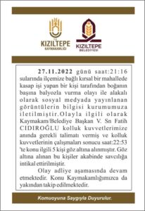 Durum hakkında Kızıltepe Kaymakamlığından açıklama yapıldı. Açıklamada; durumun kaymakamlığa bildirildiği ve hemen ardından Kaymakam Fatih Cıdıroğlu'nun talimatıyla kolluk kuvvetlerinin harekete geçmesiyle olayla ilgili 5 kişinin gözaltına alındığı, savcılığa sevk edilen şüphelilerin adli işlemlerinin devam ettiği kaydedildi. iha