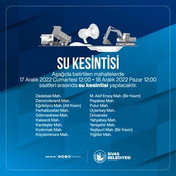 Sivas Belediyesi yaptığı açıklamada: ” 17.12.2022 Cumartesi 12:00’da başlayıp 18.12.2022 Pazar günü Saat 12:00 saatleri arasında su kesintisi yapılacaktır.” ifadelerine yer verildi.