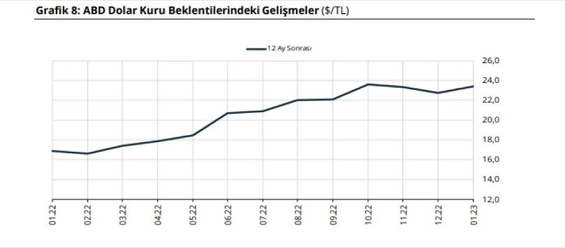 Piyasa katılımcıların 12 ay sonrası döviz kuru beklentisi ise bir önceki anket döneminde 22,77 TL iken, bu anket döneminde 23,43 TL olarak gerçekleşti.