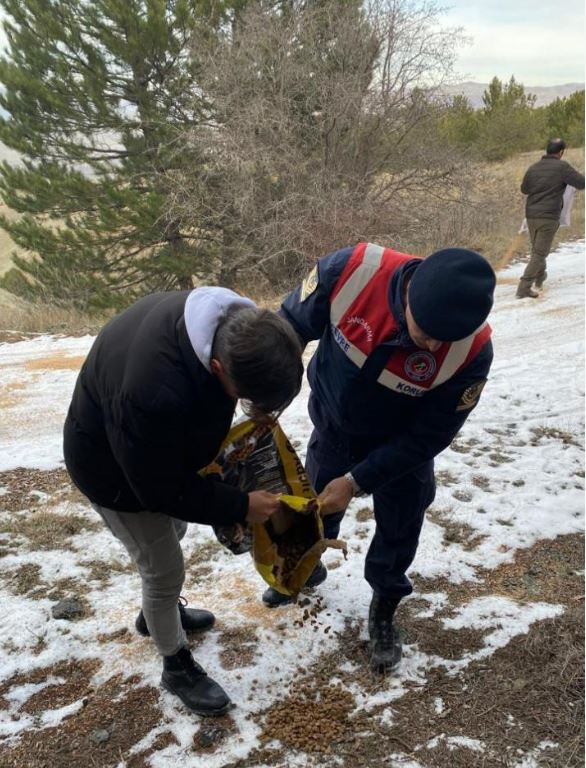 Sivas’ta Jandarma, DKMP ekipleri, akademisyen ve öğrenciler tarafından kış şartlarında yiyecek bulmakta zorlanan yaban hayvanları için doğaya yem bırakıldı.