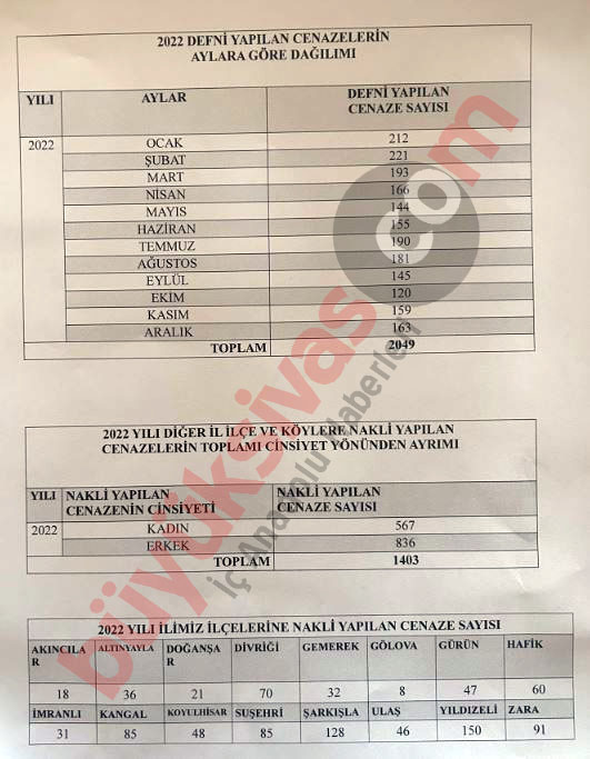 2022 yılında Sivas'ta ölen kişi sayısı toplamda 2049 olarak açıklandı. 1403 vefat eden kişinin ise cenazeleri ilçelerine nakledildi.