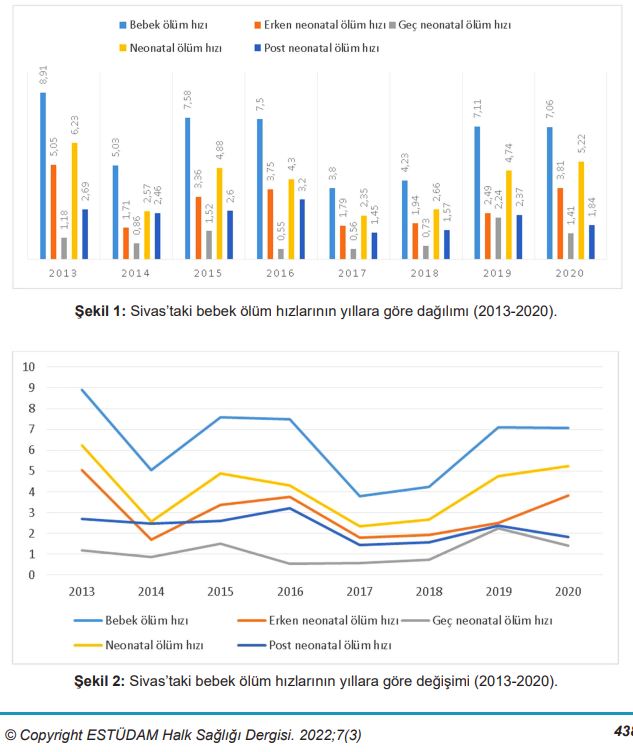 Araştırmada yer alan "Sivas’taki bebek ölüm hızlarının 2013-2020 yılları arasındaki dağılımı ve değişimi Şekil 1 ve 2’de verilmiştir. Sivas’ta bebek ölüm hızı 2013 ve 2019 yılları arasında sırasıyla binde 8,91, 5,03, 7,58, 7,50, 3,80, 4,23, 7,11 ve 7,06 idi" ifadeleri de dikkat çekti.
