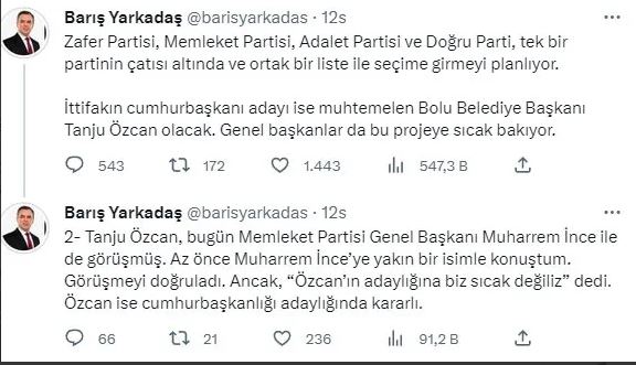 "Zafer Partisi, Memleket Partisi, Adalet Partisi ve Doğru Parti, tek bir partinin çatısı altında ve ortak bir liste ile seçime girmeyi planlıyor." ifadelerini kullanan Yarkadaş, cumhurbaşkanlığı adaylığı için ise Bolu Belediye Başkanı Tanju Özcan'ı işaret etti.