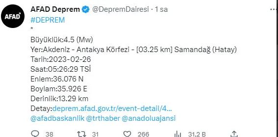 AFAD, Hatay’ın Samandağ İlçesi’nde saat 05.26’da 4.5 büyüklüğünde deprem meydana geldiğini duyurdu. Öte yandan Kahramanmaraş'ta da az önce yeni bir sarsıntı yaşandı.