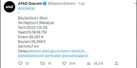 Malatya'da yeni deprem oldu. Doğanşehir ilçesinde 09:38'de 4.1 şiddetinde deprem meydana geldi.