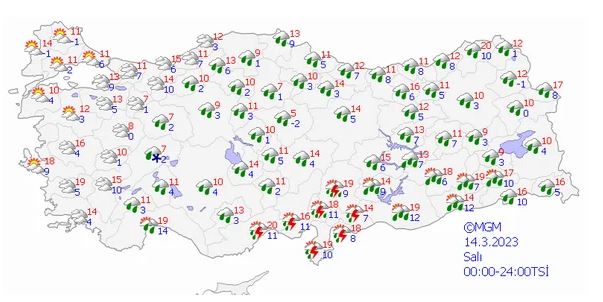 Yağışların, Batı Akdeniz, İç Anadolu'nun kuzeybatısı, Orta Karadeniz ile Muğla, Denizli, Uşak, Afyonkarahisar, Konya, Aksaray, Nevşehir ve Sinop çevrelerinin kuvvetli, Antalya'nın kuzey ve doğusunda çok kuvvetli olması bekleniyor.