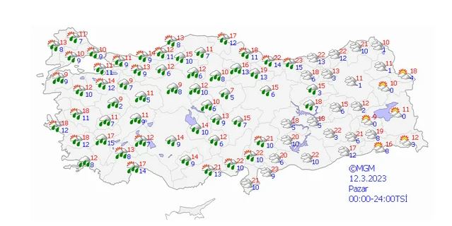 Türkiye soğuk ancak kurak geçen kış ayının ardından Mart yağışları için ümitlendi. Meteoroloji'den üst üste şehirlere yağış uyarısı gelmeye başladı. Meteoroloji, pazar günü için 57 şehre sarı ve turuncu kodlu uyarıda bulundu. Meteoroloji'nin paylaştığı, Türkiye'de 5 günlük haritalı hava durumu raporu dikkat çekti. İşte güncel hava durumu...