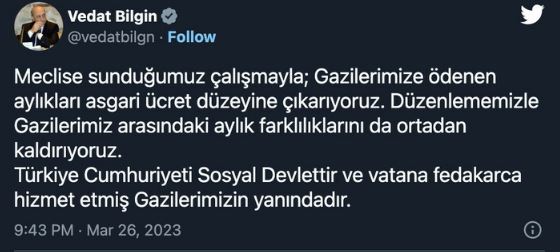 Bilgin, sosyal medya hesabından yaptığı paylaşımda, "Meclis'e sunduğumuz çalışmayla gazilerimize ödenen aylıkları asgari ücret düzeyine çıkarıyoruz. Düzenlememizle gazilerimiz arasındaki aylık farklılıklarını da ortadan kaldırıyoruz. Türkiye Cumhuriyeti sosyal devlettir ve vatana fedakarca hizmet etmiş gazilerimizin yanındadır" ifadelerini kullandı.