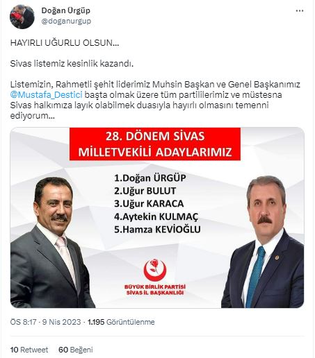 28. Dönem TBMM seçimlerinde Büyük Birlik Partisi Sivas Milletvekili adayı olarak 1. sıradan gösterilen e. Sivas Belediye Başkanı Doğan Ürgüp sosyal medya hesabından açıklama yaptı.