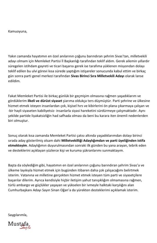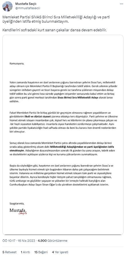 9 Nisan 2023 tarihinde Yüksek Seçim Kuruluna teslim edilen Milletvekili Aday listelerinde Memleket Partisi Sivas 1. Sıra adayı olarak yer alan Mustafa Saçlı az önce sosyal medya hesabından yaptığı açıklama ile milletvekili adaylığından ve partisinden istifa ettiğini duyurdu.