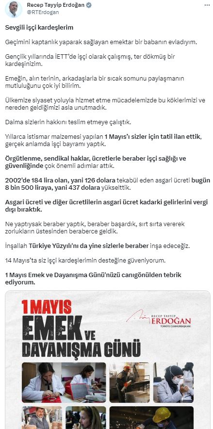 Cumhurbaşkanı Erdoğan Sosyal Medya Hesabından Paylaştı! 1 Mayıs..