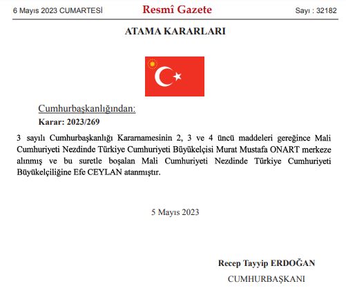 Buna göre, Türkiye'nin Mali Cumhuriyet Nezdinde Türkiye Cumhuriyeti Büyükelçi'liğine Efe Ceylan atandı.