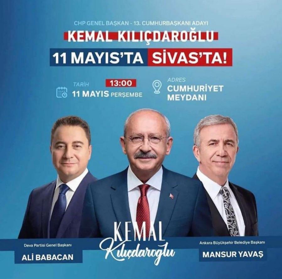 Seçimlere çok az bir süre kala Millet İttifakı Sivas'ta bugün miting düzenleyecek.