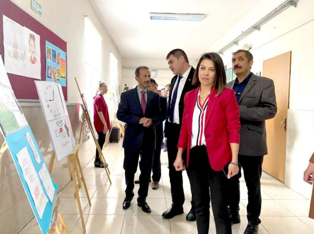 Okul Müdürü Enver Yıldız eşliğinde sergiyi gezerek öğrencilerin çalışmaları hakkında bilgi alan Bozbıyık ve Çatal, serginin düzenlenmesinde emeği olan öğrenci ve öğretmenleri tebrik etti. (İHA)