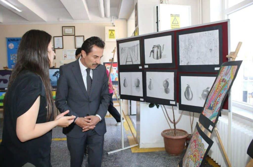 Aslan, daha sonra Okul Müdürü Sebahattin Eker eşliğinde sergiyi gezerek öğrencilerin çalışmalarını yakından inceledi.