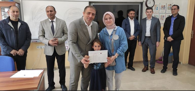 Ulaş İlkokulu’nda düzenlenen karne dağıtım törenine katılan Kaymakam Selçuk Baş, eşi Meltem Baş ile öğrencilere karne verdi.
