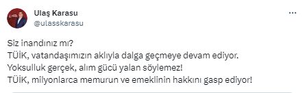 CHP Sivas Milletvekili Ulaş Karasu sosyal medya hesabından yaptığı paylaşımda: "Siz inandınız mı? TÜİK, vatandaşımızın aklıyla dalga geçmeye devam ediyor. Yoksulluk gerçek, alım gücü yalan söylemez! TÜİK, milyonlarca memurun ve emeklinin hakkını gasp ediyor!" ifadelerine yer verdi.