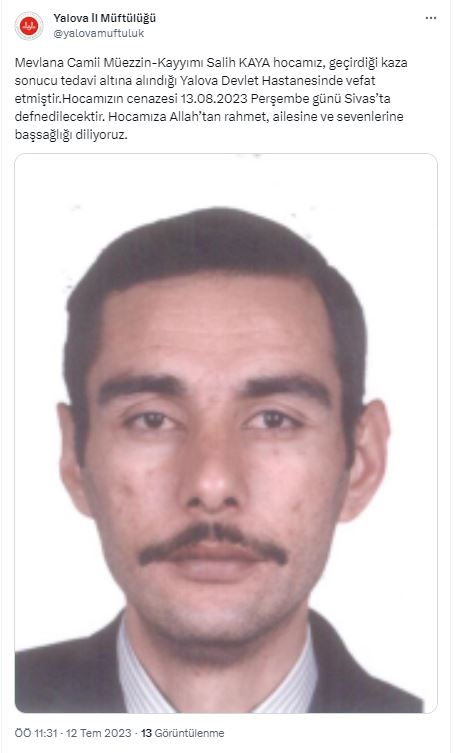 Yapılan açıklamada: "Mevlana Camii Müezzin-Kayyımı Salih KAYA hocamız, geçirdiği kaza sonucu tedavi altına alındığı Yalova Devlet Hastanesinde vefat etmiştir. Hocamızın cenazesi 13.08.2023 Perşembe günü Sivas’ta defnedilecektir. Hocamıza Allah’tan rahmet, ailesine ve sevenlerine başsağlığı diliyoruz." ifadelerine yer verildi.