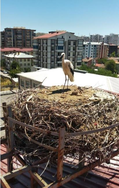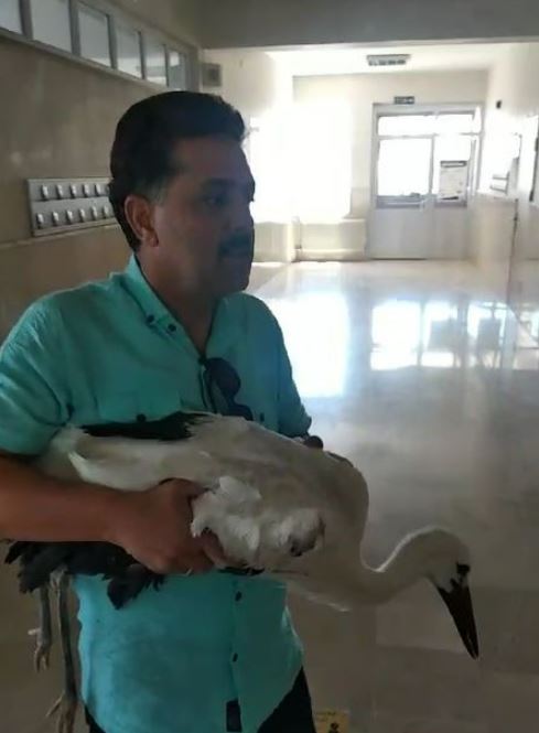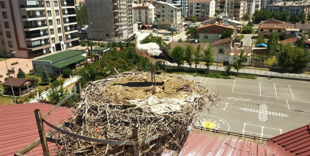 Sivas'ta okul müdürü leyleği kucaklayıp çatıya çıkardı