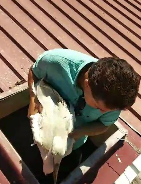 #Sivas'ta, yuvasından düşen #leylek yavrusu, yuvanın bulunduğu okulun müdürü tarafından yeniden çatıya çıkarıldı. pic.twitter.com/JB4llQ2T8S