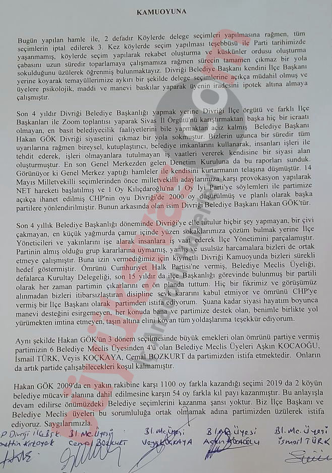 İstifa açıklamasında: " Parti tarihimizde yaşanmamış, köylerde seçim yapılarak rekabet oluşturma ve küskünler ordusu oluşturma çabasını uzun süredir toparlamaya çalışmamıza rağmen sürecin tamamen çıkmaz bir yola sokulduğunu üzülerek öğrenmiş bulunmaktayız. Divriği Belediye Başkanı kendini İlçe Başkanı yerine koyarak temayüllerimize aykırı bir şekilde delege seçimlerine açıkça müdahil olmuş ve üyelere psikolojik, maddi ve manevi baskılar yaparak üyenin iradesini ipotek altına almaya çalışmıştır." ifadelerine yer verildi.