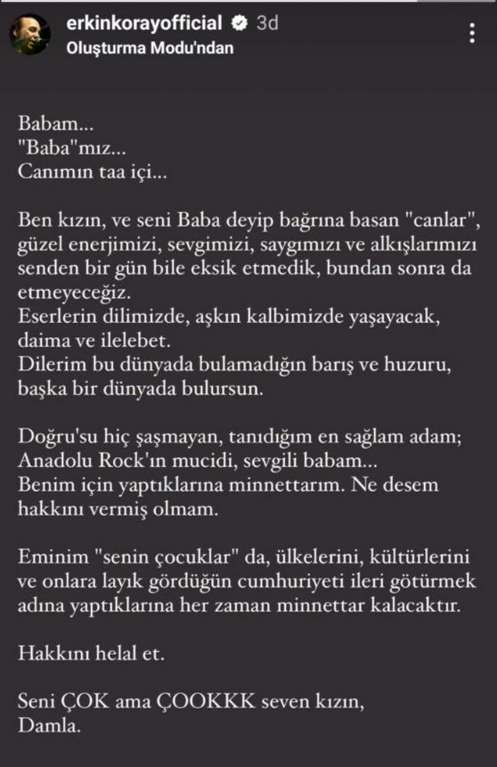 Acı haberi kızı Erkin Koray'ın sosyal medya hesabından duyurdu.