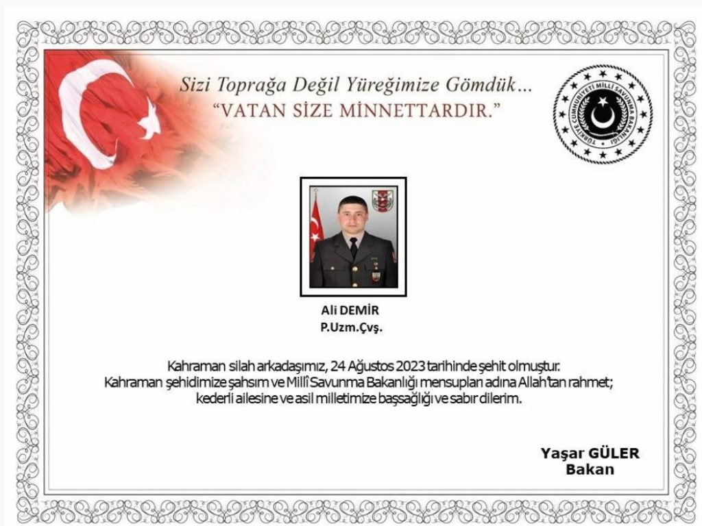 MSB’den yapılan açıklamada, “Pençe-Kilit operasyonu bölgesinde, 24 Ağustos 2023 tarihinde, bir üs bölgesinden yol emniyetine çıkan unsurlara bölücü terör örgütü mensuplarınca açılan taciz ateşi sonucunda kahraman silah arkadaşımız P. Uzm. Çvş. Ali Demir ağır yaralanmış ve kaldırıldığı hastanede yapılan tüm müdahalelere rağmen kurtarılamayarak şehit olmuştur. Bizleri derin bir acı ve üzüntüye boğan bu olayda hayatını kaybeden aziz şehidimize Allah’tan rahmet, kederli ailesine, Türk Silahlı Kuvvetleri ile asil milletimize başsağlığı ve sabır dileriz” ifadelerine yer verildi.