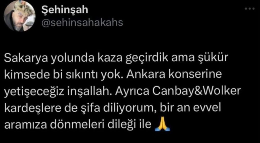 Dün İstanbul’dan Ankara’ya giden rap sanatçısı Şehinşah, Sakarya’da kaza yaptı. Şehinşah adıyla tanınan rapçi Ufuk Yıkılmaz, geçirdikleri kazayı sosyal medya hesabından paylaştı. Şarkıcı yaptığı paylaşımda, “Sakarya yolunda kaza geçirdik ama şükür kimsede bir sıkıntı yok. Ankara konserine yetişeceğiz inşallah. Ayrıca Canbay&Wolker kardeşlere de şifa diliyorum, biran evvel aramıza dönmeleri dileği ile” ifadelerine yer verdi.