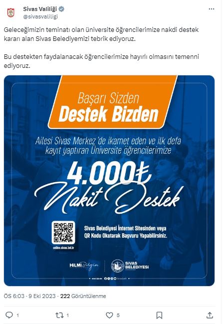 "Geleceğimizin teminatı olan üniversite öğrencilerimize nakdi destek kararı alan Sivas Belediyemizi tebrik ediyoruz.