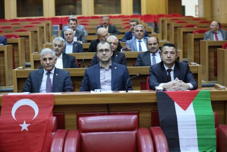 İl Genel Meclisi Başkanımız Hakan Akkaş’ın meclise hitaben yaptığı konuşmanın ardından hazırlanan video klip izlendi. Meclis salonunda Türk bayraklarımızın yanı sıra Filistin bayrağı da yer aldı.