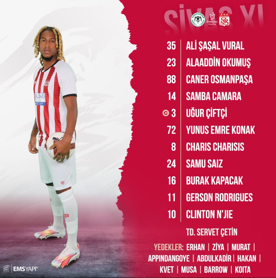 Konyaspor: Bernardoni, Ahmet, Adil, Calvo, Guilherme, Soner, Oğulcan, Muric, Cicaldau, Marlos, Cikalleshi