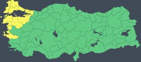 Sarı uyarı verilen iller Balıkesir, Bursa, Çanakkale, Edirne, İstanbul, İzmir, Kırklareli, Kocaeli, Tekirdağ ve Yalova olarak sıralandı.