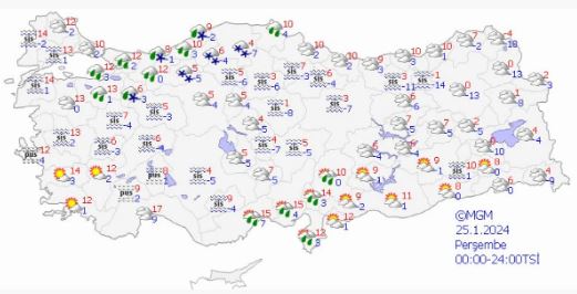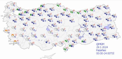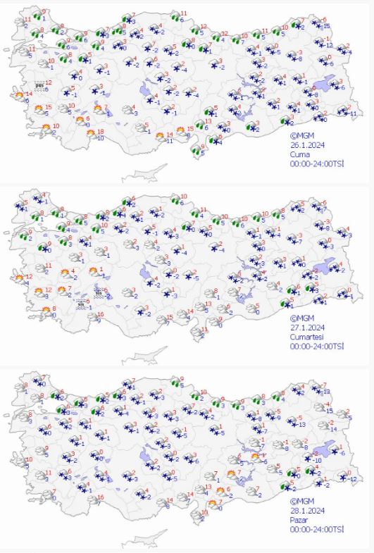 Meteoroloji Genel Müdürlüğü'nden (MGM) yapılan tahmine göre akşam saatlerinden itibaren Bolu çevreleri, Zonguldak, Bartın, Karabük, Düzce ve Kastamonu'nun kuzeyinin yüksek kesimleri ile Sakarya'nın güney ve doğusunun yükseklerinde kuvvetli kar görülecek.